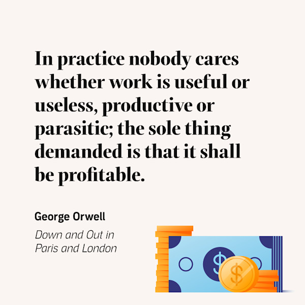 40. “In practice nobody cares whether work is useful or useless, productive or parasitic; the sole thing demanded is that it shall be profitable.” – George Orwell, Down and Out in Paris and London